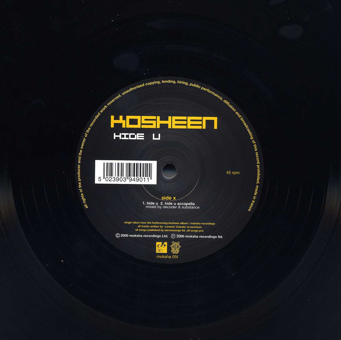 the first kosheen 12″ up from the vaults is their debut single on moksha – ‘hide u’ (from the ‘resist’ album) – hurry if you want this – there’s a very limited quantity available.